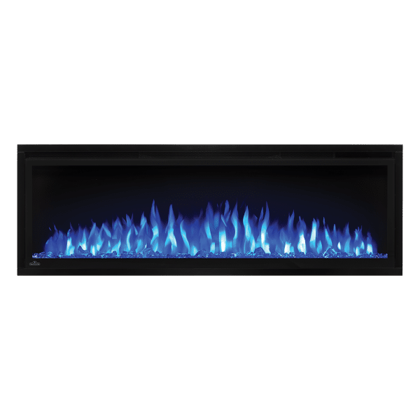 Make a statement with the Napoleon Entice™ 50 Electric Fireplace. This fireplace puts out an incredible amount of heat, glittering with multicoloured flames and a crystal ember bed. You don’t need a specialist or a gas fitter for this expansive beauty, just hang on the wall and plug in for instant transformation of your space. Traditional orange flames, or cool blue flames, or a combination of the two will set the mood. The shallow depth means that this fireplace doesn’t intrude into your living space, but simply accents it with the expansive view of the fire. Place this electric fireplace anywhere you want to make a huge impact, perfectly suited for either your home or a commercial setting.